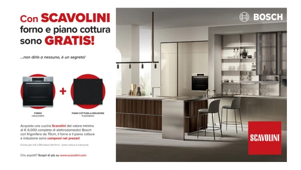 Se stai considerando di rinnovare il tuo spazio cucina con elettrodomestici di alta qualità, questa è l'occasione che fa per te. Acquistando una cucina Scavolini dal valore minimo di €6000, comprensiva di un frigorifero Bosch da 70 cm, riceverai in omaggio il piano cottura a induzione e il forno.